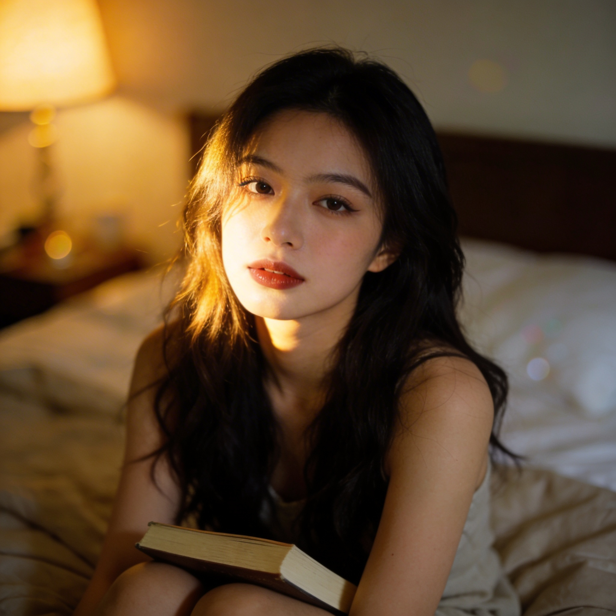 22-year-old soft-featured woman, long dark hair, natural makeup, warm indoor bedroom lighting, DSLR realism, shallow depth of field